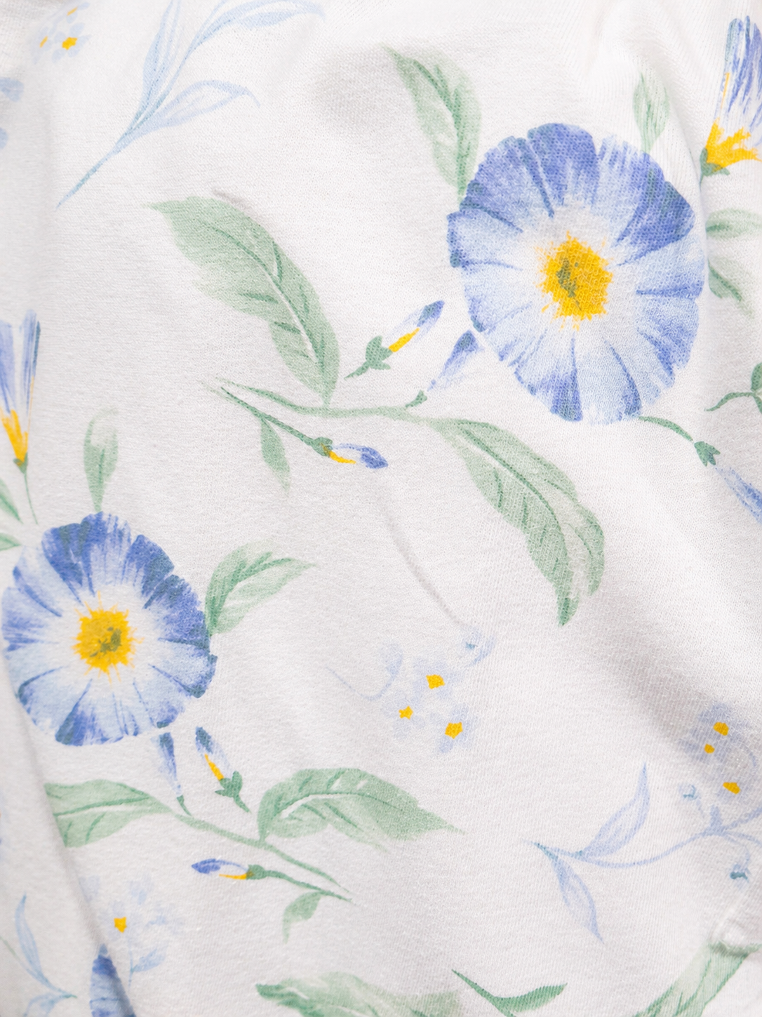 La fantasia floreale nei toni dell’azzurro e verde su fondo bianco dona un effetto fresco, delicato e rilassante, perfetto per la stagione primaverile ed estiva.