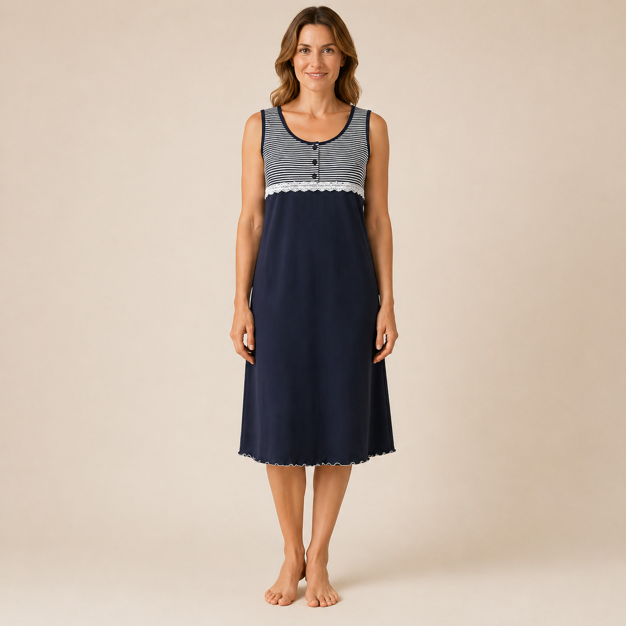 Camicia da notte Julie  in puro cotone, senza maniche, con raffinato inserto in pizzo e fantasia rigata, perfetta per garantire freschezza e comfort nelle notti più calde.