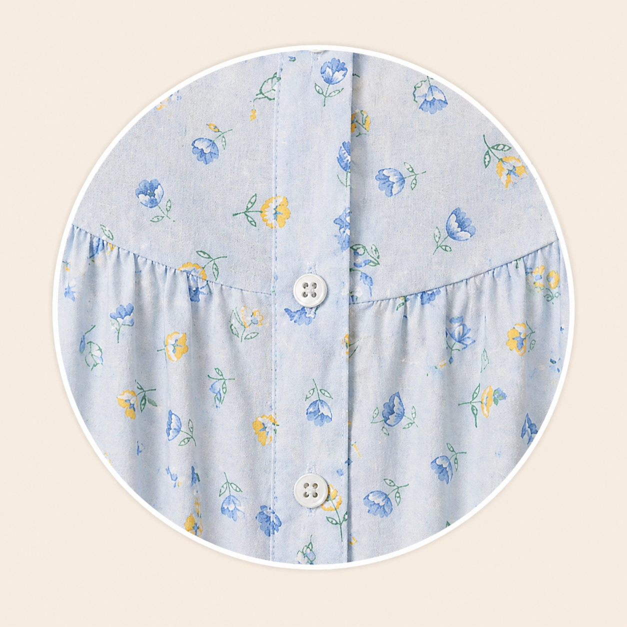 Camicia da notte Linclalor in cotone batista leggero, con fantasia floreale delicata su fondo azzurro, apertura con bottoni e arricciatura sul davanti, perfetta per chi cerca leggerezza per la notte.