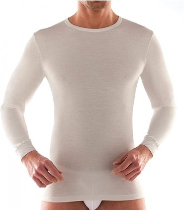 Maglia  girocollo a manica lunga che permette di avere il calore della lana senza averla a contatto con la pelle grazie al tessuto double in misto lana fuori e puro cotone all’interno.