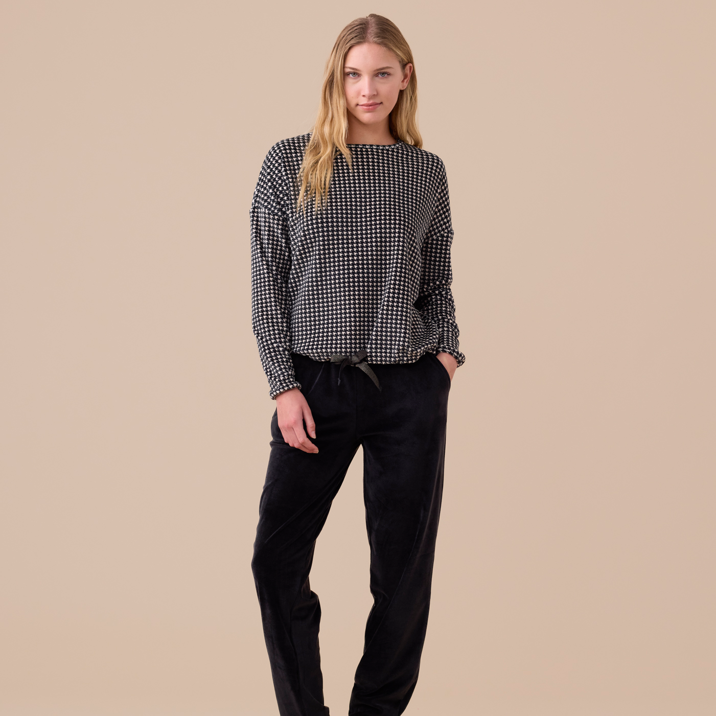 La maglia a manica lunga girocollo è impreziosita dalla classica fantasia pied de poule, un evergreen della moda che regala eleganza anche nei momenti di relax.