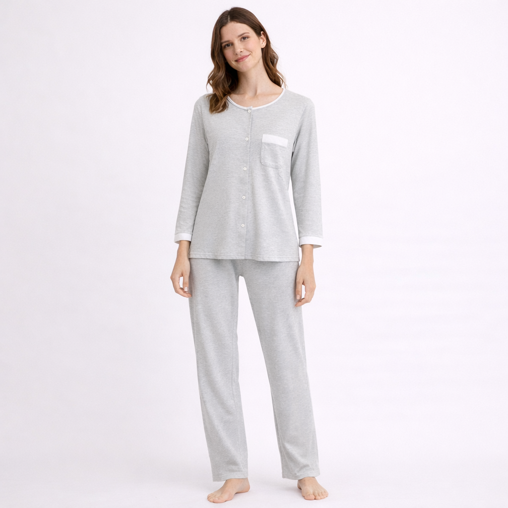 La giacca aperta con bottoni rende il pigiama estremamente funzionale e facile da indossare, mentre il taschino sul petto aggiunge un dettaglio pratico e discreto, che dona anche un tocco di stile.