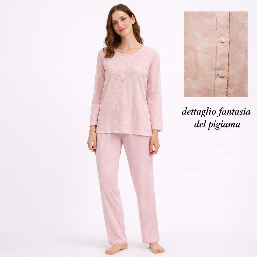 Pigiama donna Zero Pigiamore in cotone leggero con maglia serafino con fantasia delicata  + pantalone lungo tinta unita, fresco, morbido e perfetto per il relax quotidiano.
