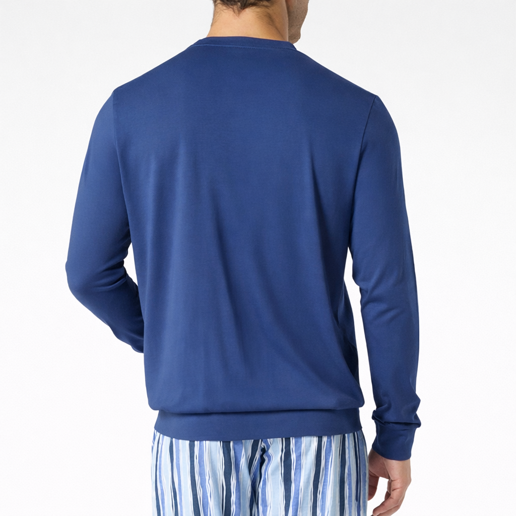 La maglia girocollo a manica lunga, in elegante tonalità blu denim, offre una vestibilità slim ed è perfetta anche per momenti di relax in casa.