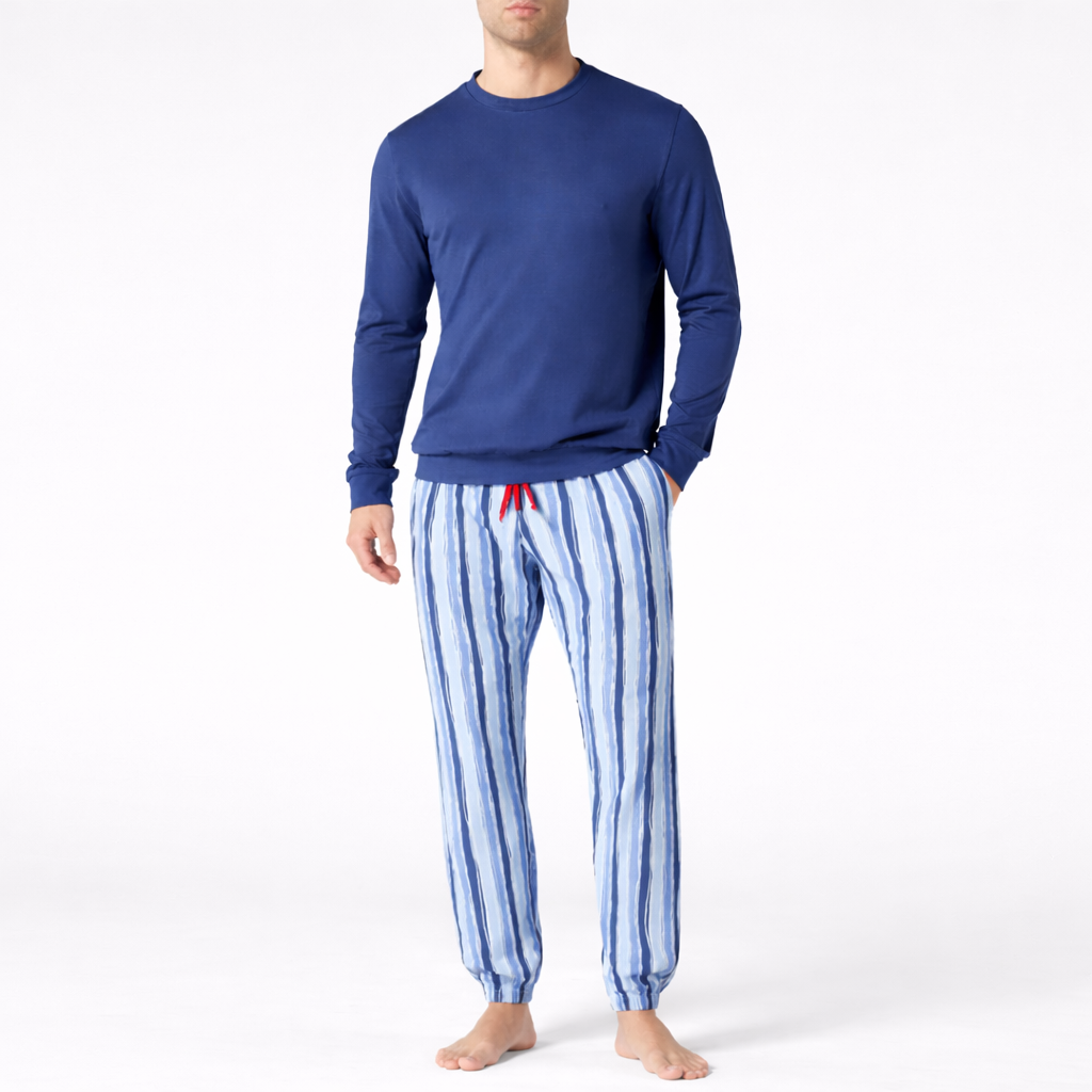Pigiama uomo Perofil in cotone leggero composto da maglia girocollo tinta unita blu denim e pantalone a righe con coulisse regolabile: fresco, morbido e perfetto per il comfort quotidiano.