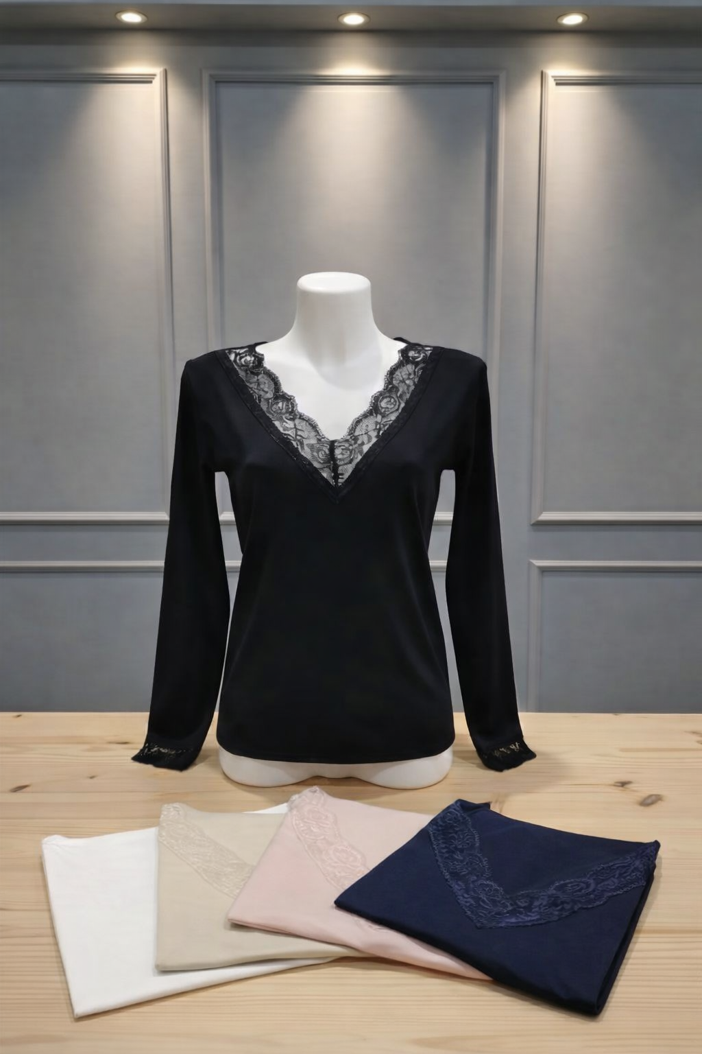 Lo scollo a V impreziosito da pizzo dona un tocco raffinato e femminile, perfetto da mostrare sotto una giacca o un cardigan.