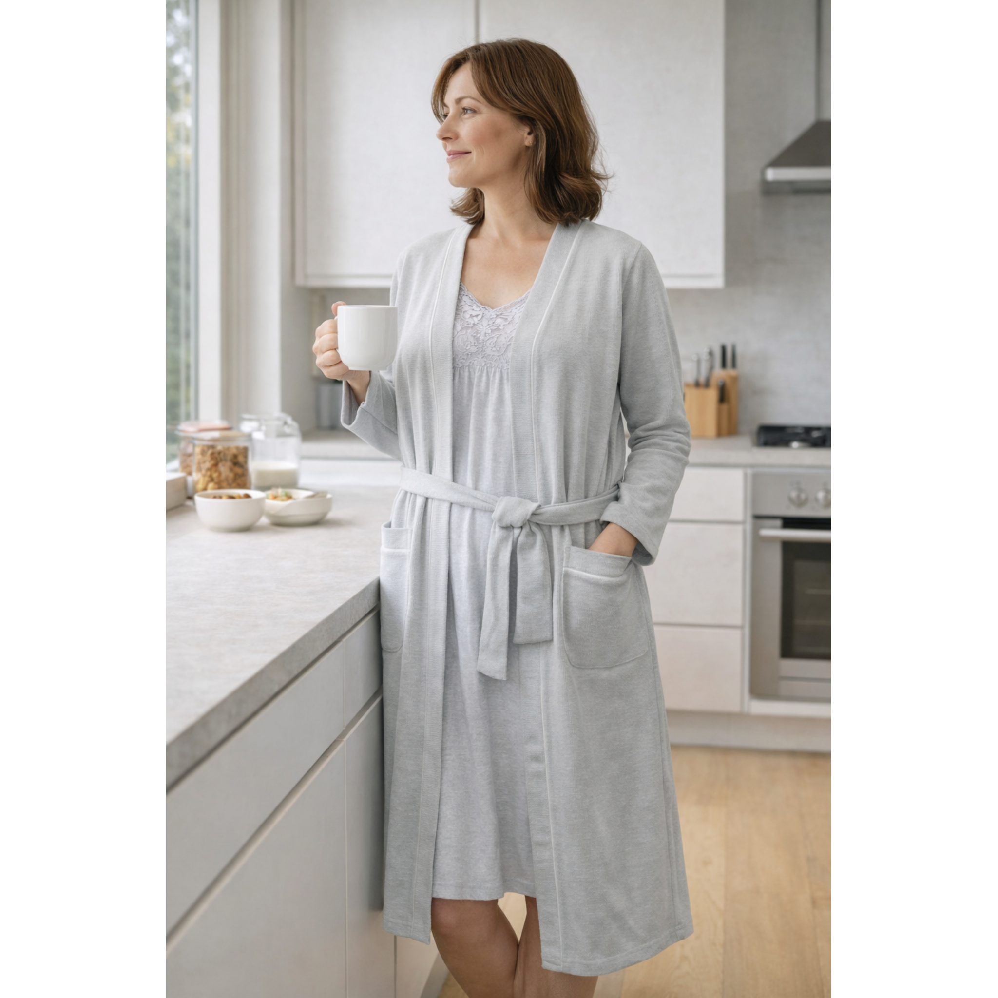 Un capo essenziale di homewear che unisce praticità ed eleganza, ideale per iniziare la giornata con dolcezza o rilassarsi la sera.
